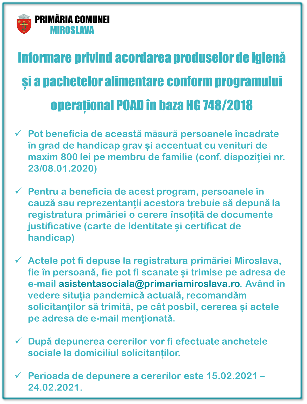 InformareInformare privind acordarea produselor de igienă și a pachetelor alimentare conform programului operațional POAD în baza HG 748/2018